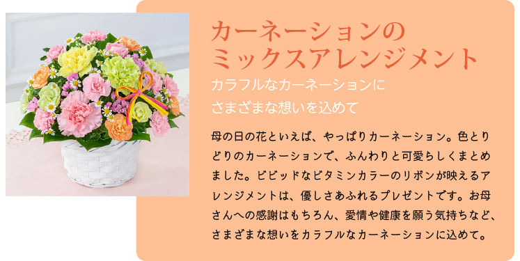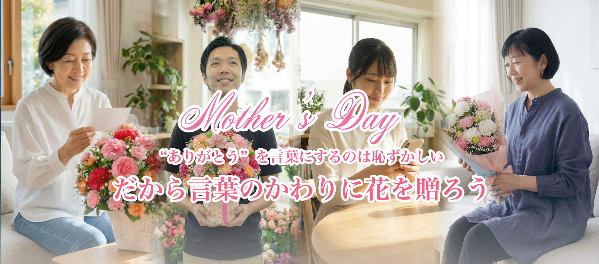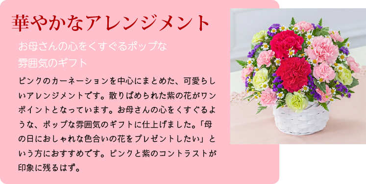 2026年5月10日(日)は母の日です。 母の日を代表するカーネーションの花束・アレンジメントをご用意しました。 高級感があるユリや、美しいバラのギフトもございます。 お母さんに花のプレゼントで「ありがとう」を伝えましょう。